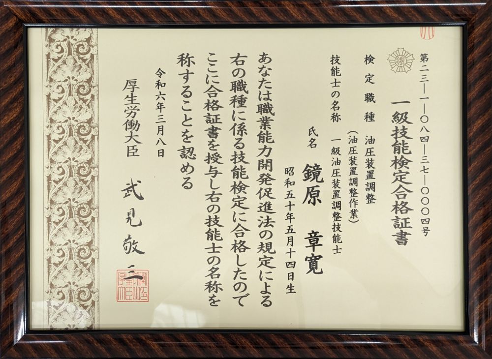 2024-03-27 お知らせ 【一級技能検定合格者】鏡原 章寛さん 当社、鏡原 章寛さんが一級技能検定に合格しました! 検定職種:油圧装置調整(油圧装置調整作業) 技能士の名称:一級油圧装置調整能士 ㊗おめでとうございます!!