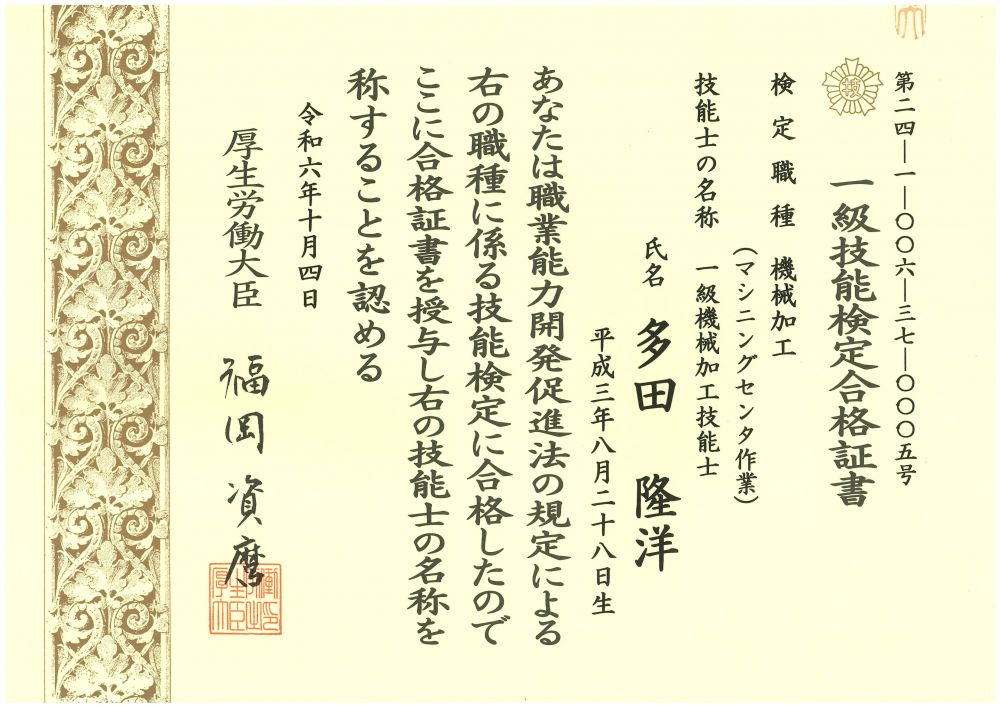 2024-12-19 お知らせ 【一級技能検定合格者】多田 隆洋さん 当社、多田 隆洋さんが一級技能検定に合格しました! 検定職種:機械加工(マシニングセンタ作業) 技能士の名称:一級機械加工技能士 ㊗おめでとうございます!!