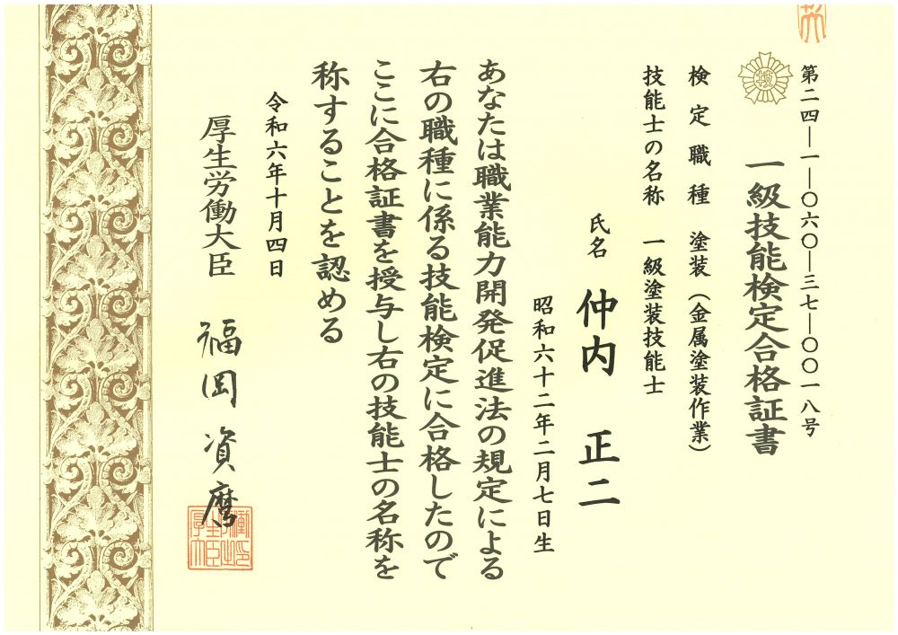 2024-12-19 お知らせ 【一級技能検定合格者】仲内 正二さん 当社、仲内 正二さんが一級技能検定に合格しました! 検定職種:塗装(金属塗装作業) 技能士の名称:一級塗装技能士 ㊗おめでとうございます!!