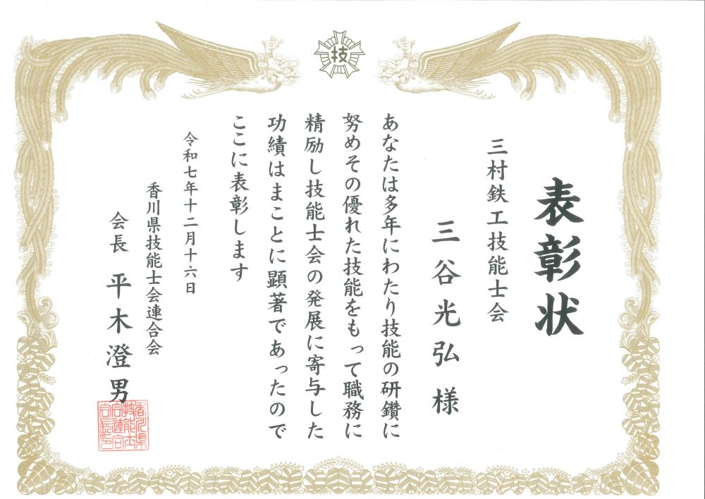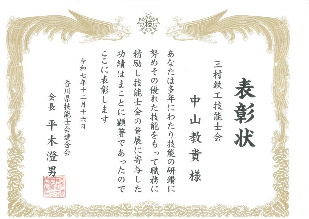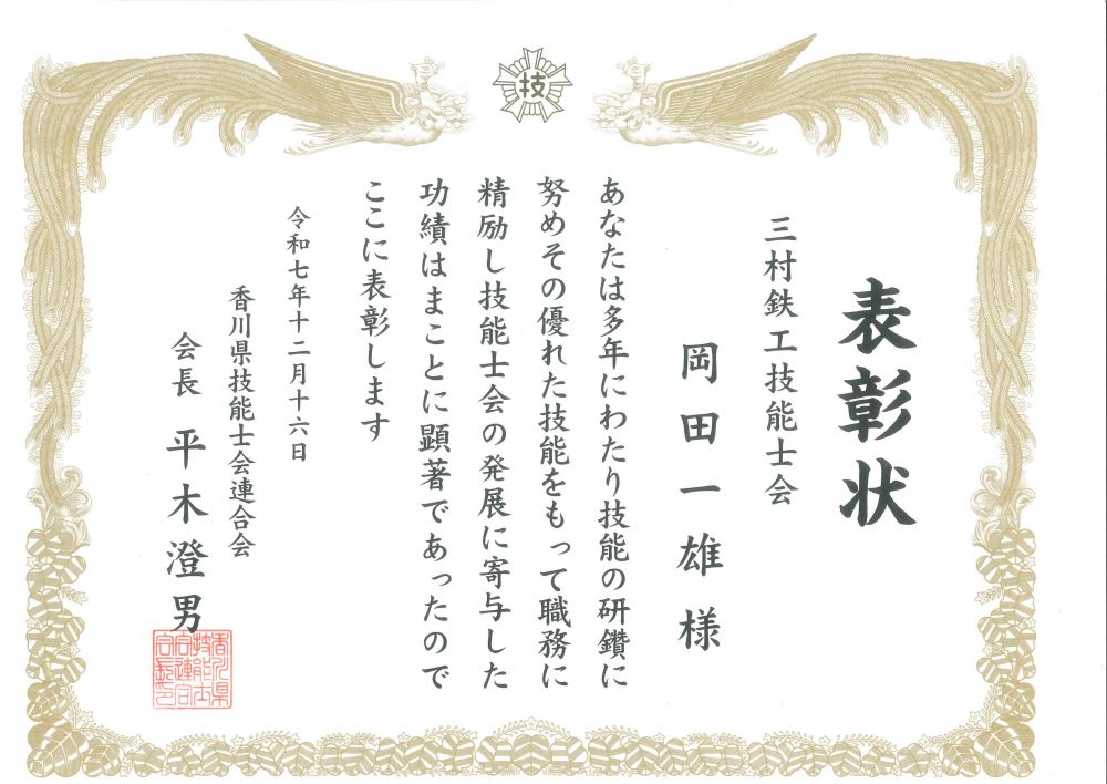 令和7年度香川県技能士会連合会会長表彰(技能士会活動功労)として当社ベテラン社員3名が表彰されました。