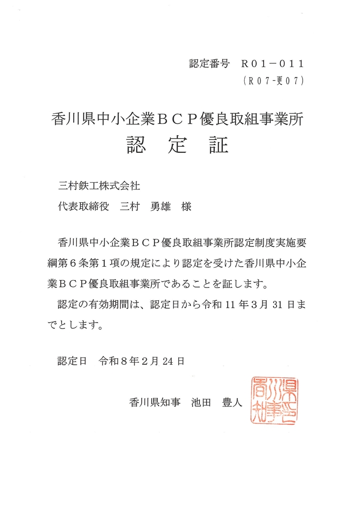香川県中小企業BCP優良取組認定事業所に認定されました。